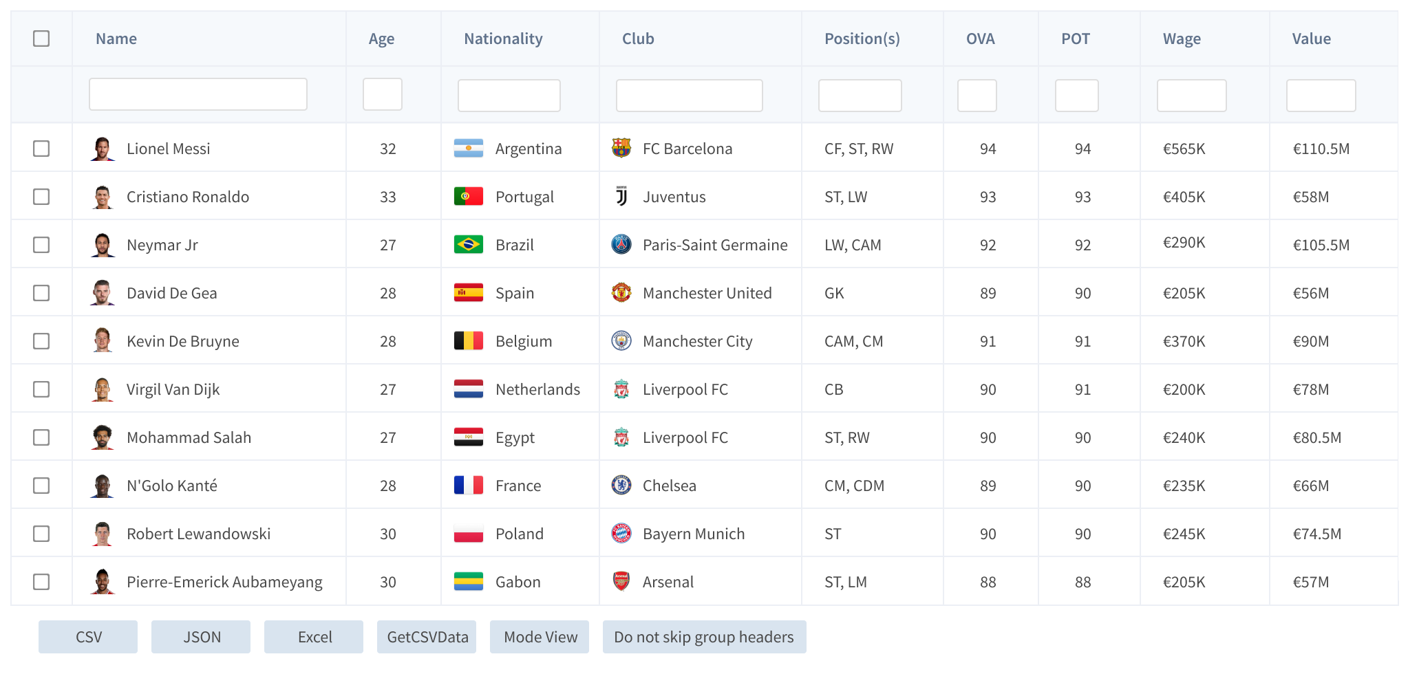 - Column grouping, nested headers and multi-row selection